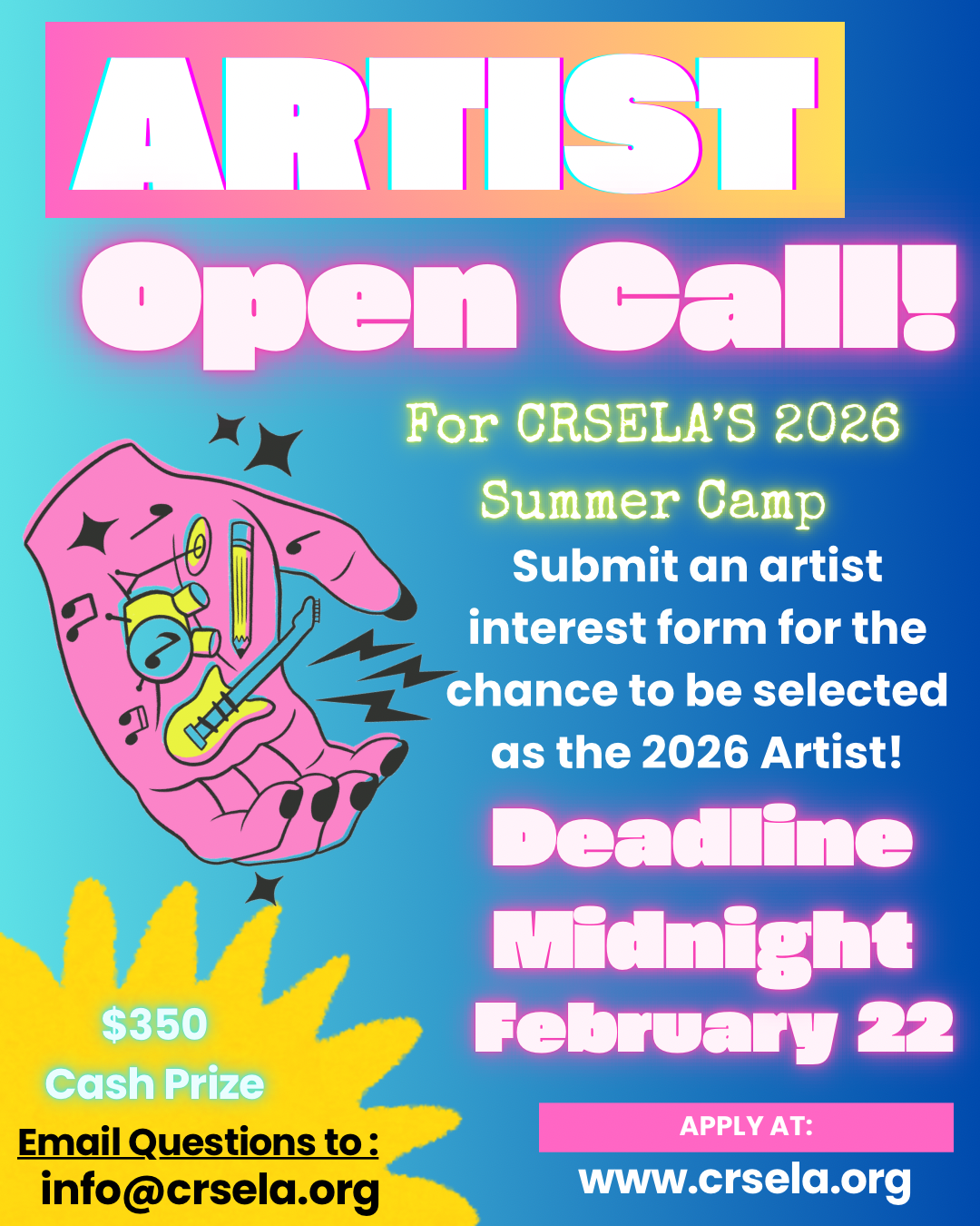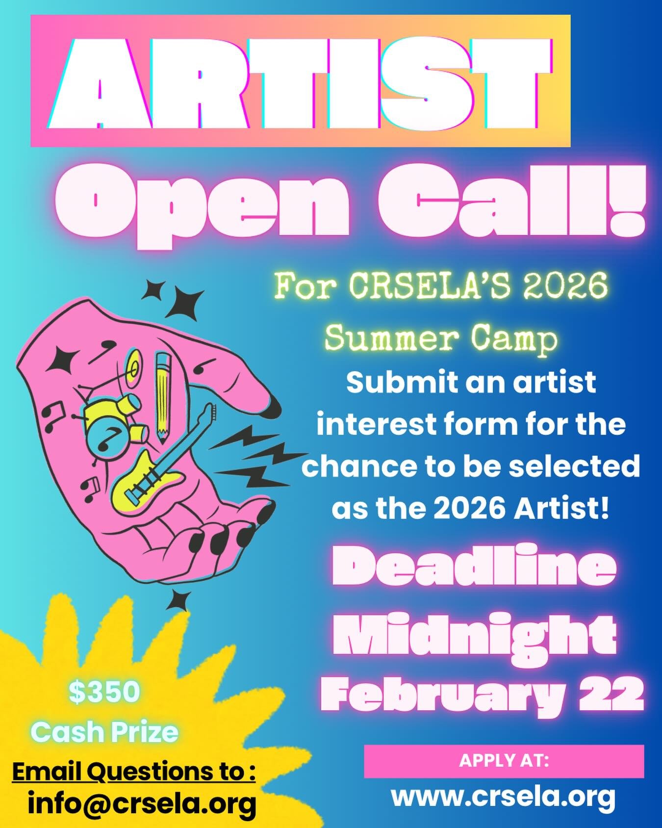 Apply to be the 2026 Summer Camp artist! As the camp artist, you will create the official 2026 camp logo and showcase flyer!! The camp artist will be selected by Lxs Sobrinxs, CRSELAβs teen organizing team.